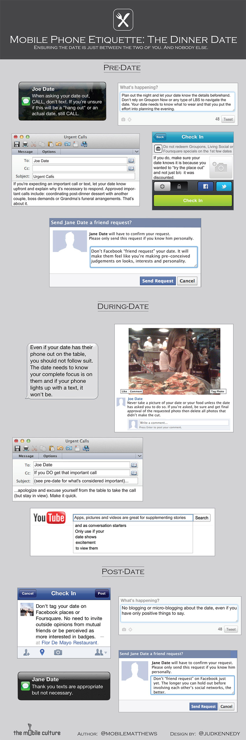Forbes contributor Michael T. Mathews sums it up pretty succinctly in a great info graphic below. He concentrates on social media and smartphone etiquette for the classic dinner date, including activities before, during and after the encounter for all you Gen Ys out there.